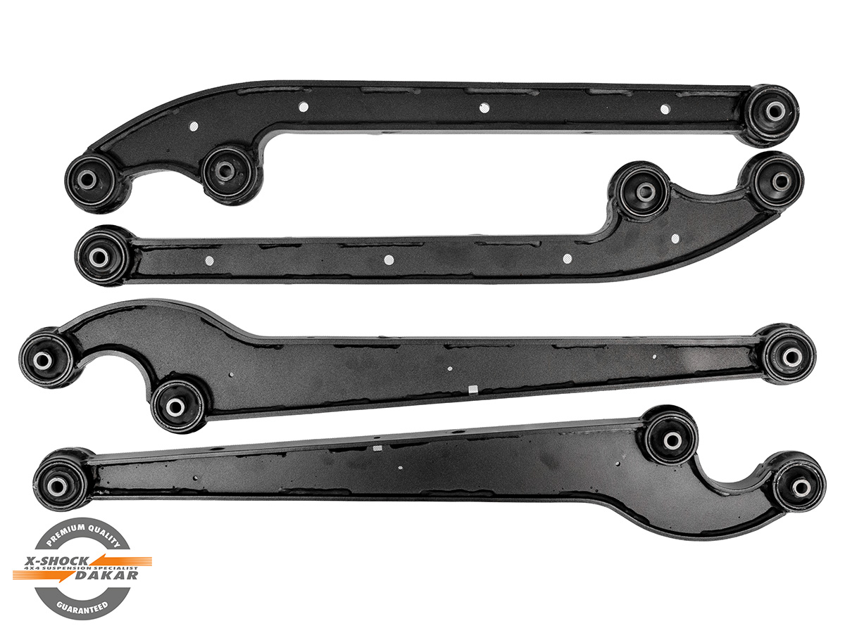 - 4 szt. wzmocnionych wahaczy (2 przednie, 2 tylne) ze zmienionym kątem pod zawieszenie lift +4", wyposażonych w wprasowane silentbloki