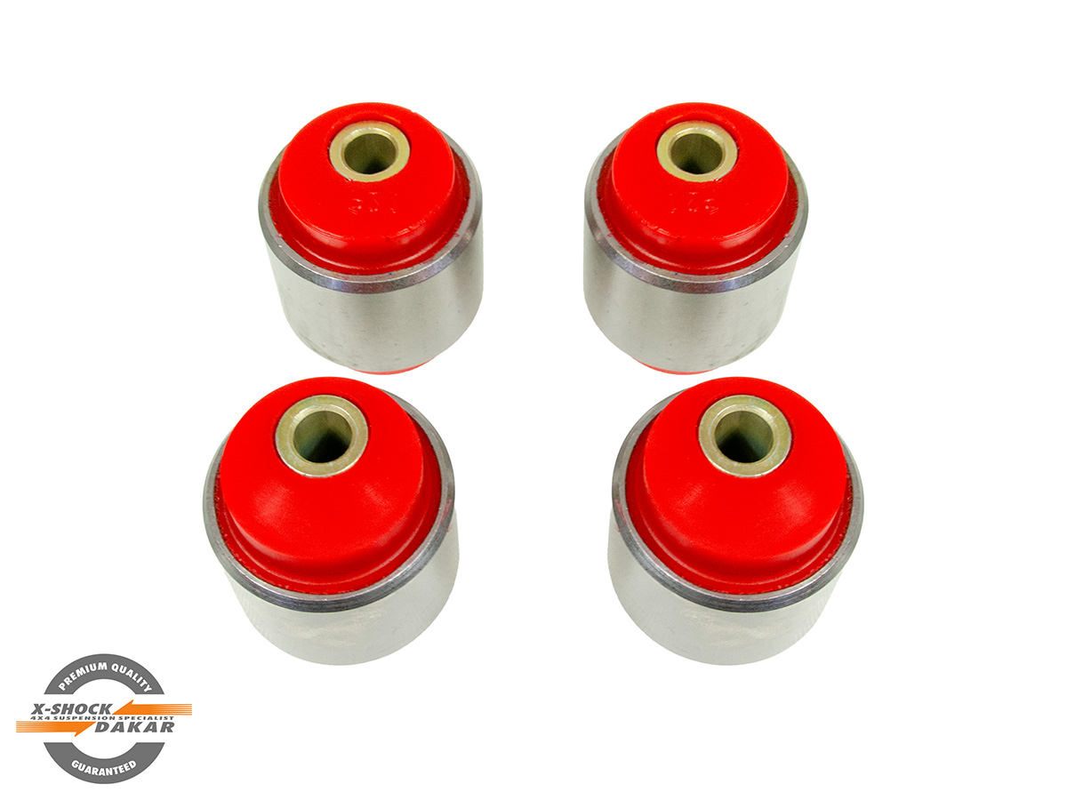 - 4 tuleje metalowo-poliuretanowe mimośrodowe – po montażu w przednich wahaczach pozwalają ustawić poprawny kąt mostu/zwrotnic