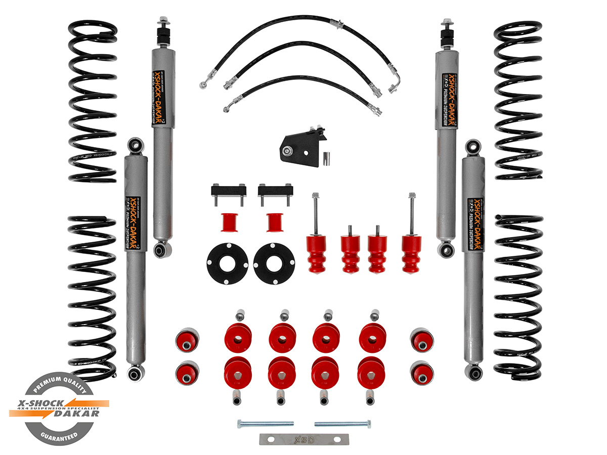 Kompletny zestaw zawieszenia podnoszący samochód o 2” (+5 cm ). Zwiększa prześwit, poprawia właściwości terenowe i umożliwia montaż większych kół, jednocześnie zachowując stabilność i komfort jazdy na drodze. Idealne rozwiązanie zarówno do codziennego użytkowania, jak i wymagających wypraw off-roadowych.