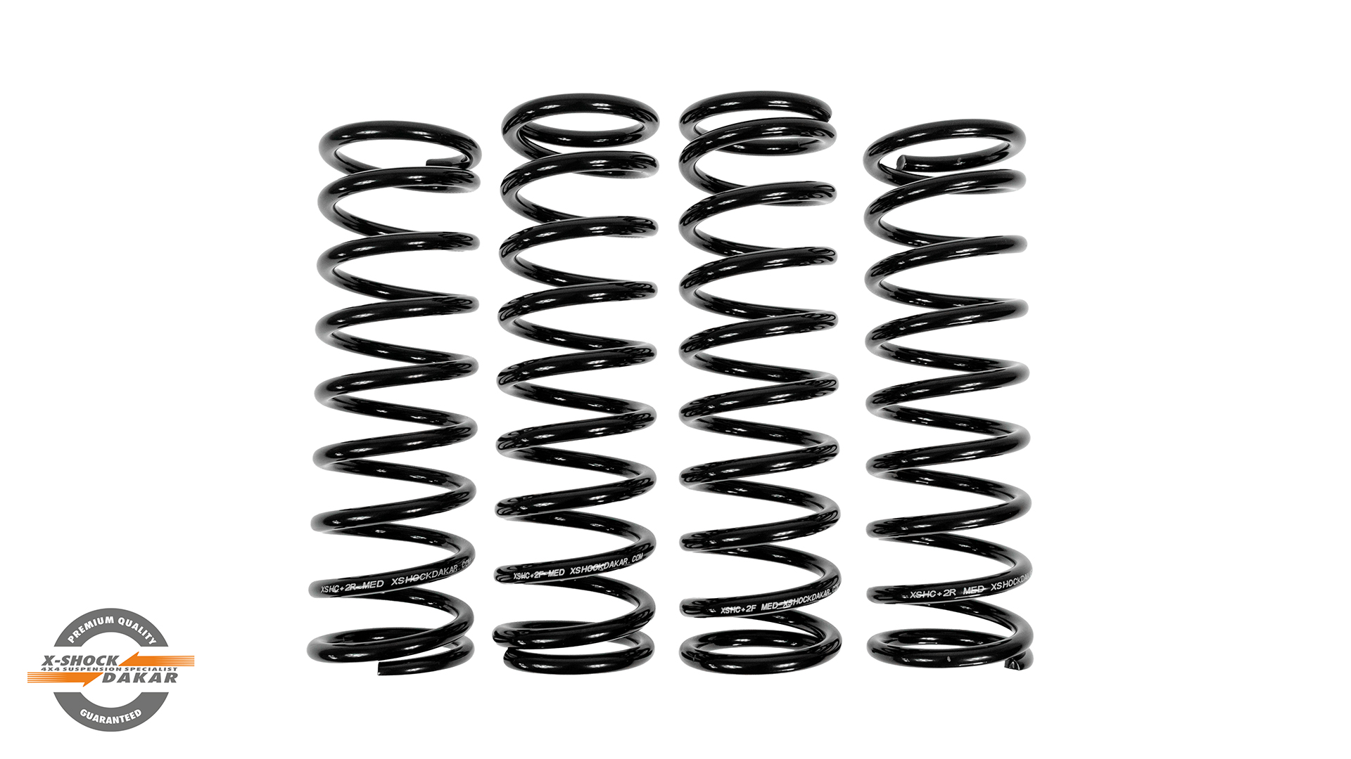 - 4 sprężyny XShockDakar.com +2" w kolorze czarnym (malowane proszkowo, fabrycznie cechowane, pełny atest i certyfikat ISO 9001:2008, produkt polski)
